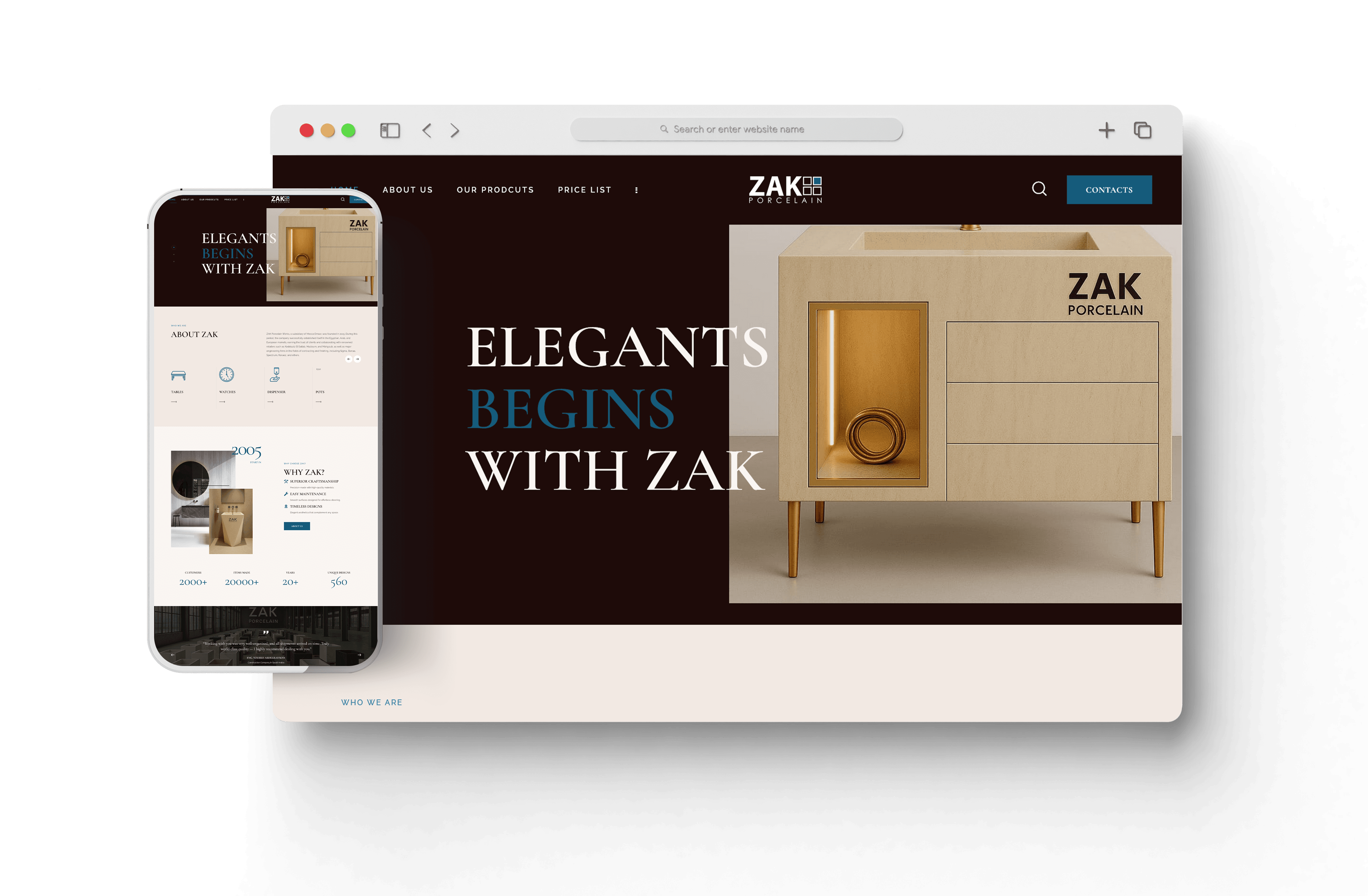 شركة ZAK Porcelain، التابعة لمكة إعمار، تأسست 2015 ونجحت في بناء سمعة قوية في مصر والعالم العربي وأوروبا عبر شراكات مع متاجر وهندسة تشطيب راقية. الهدف من المشروع هو إنشاء منصة رقمية تُظهِر منتجاتها الفاخرة مثل الأحواض، الطاولات، المطبخ، وتُعرض أعمالها السابقة، مع قائمة أسعار واضحة وتجربة تسوق أو معاينة سهلة للعملاء.